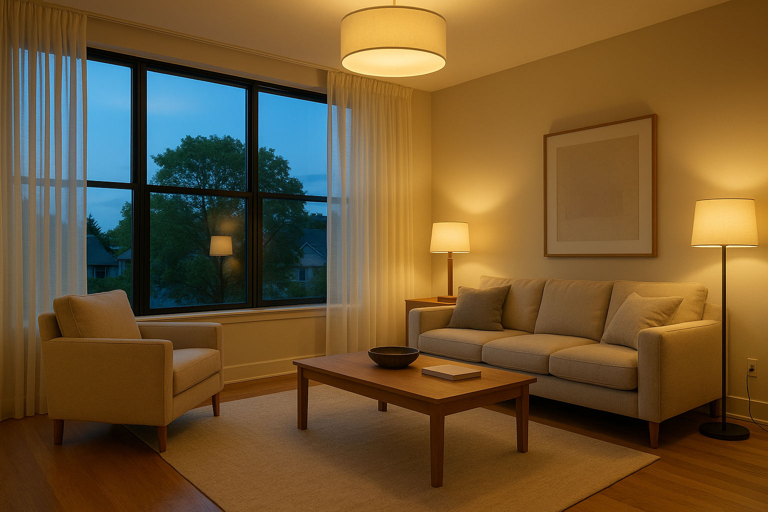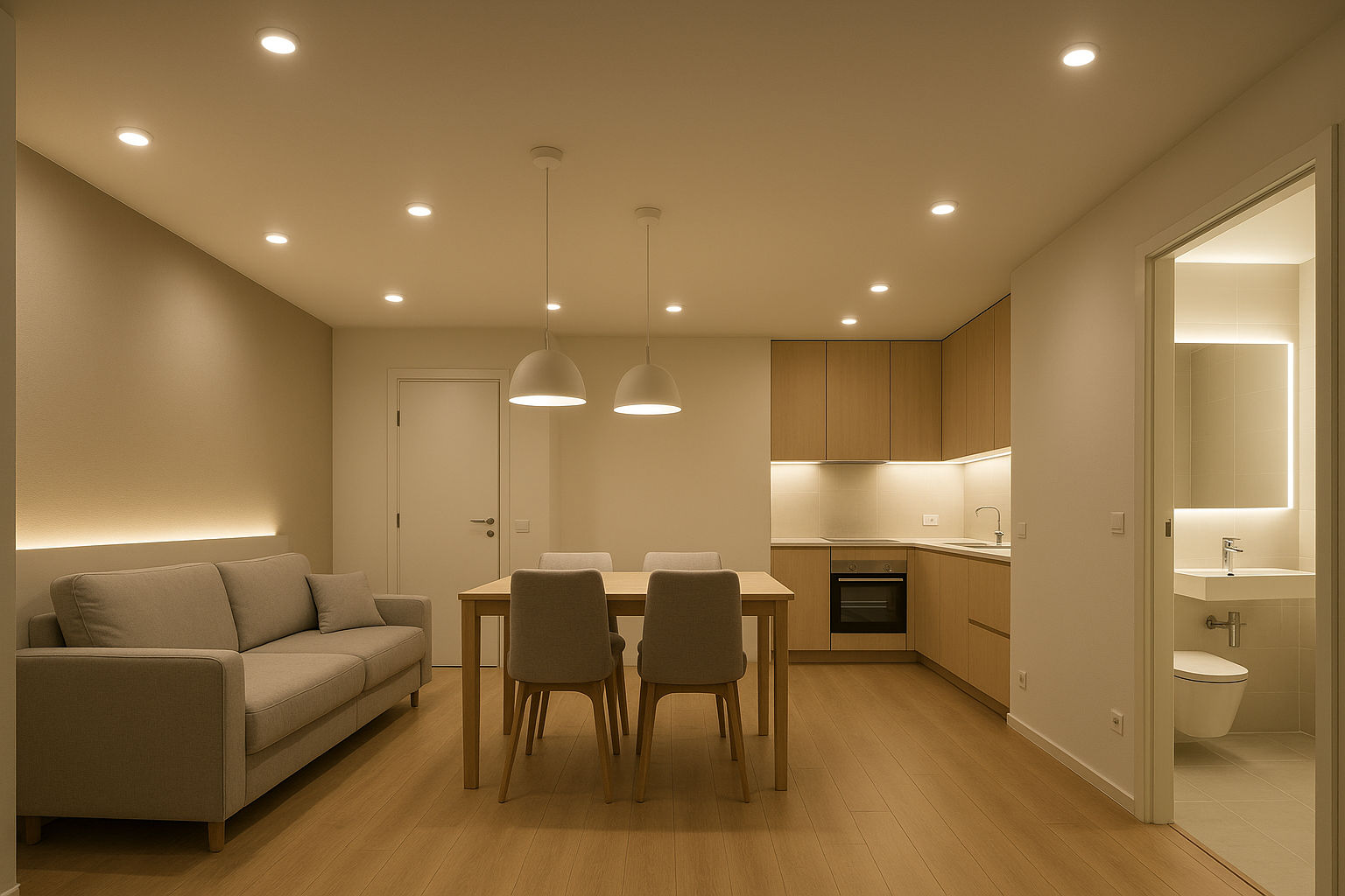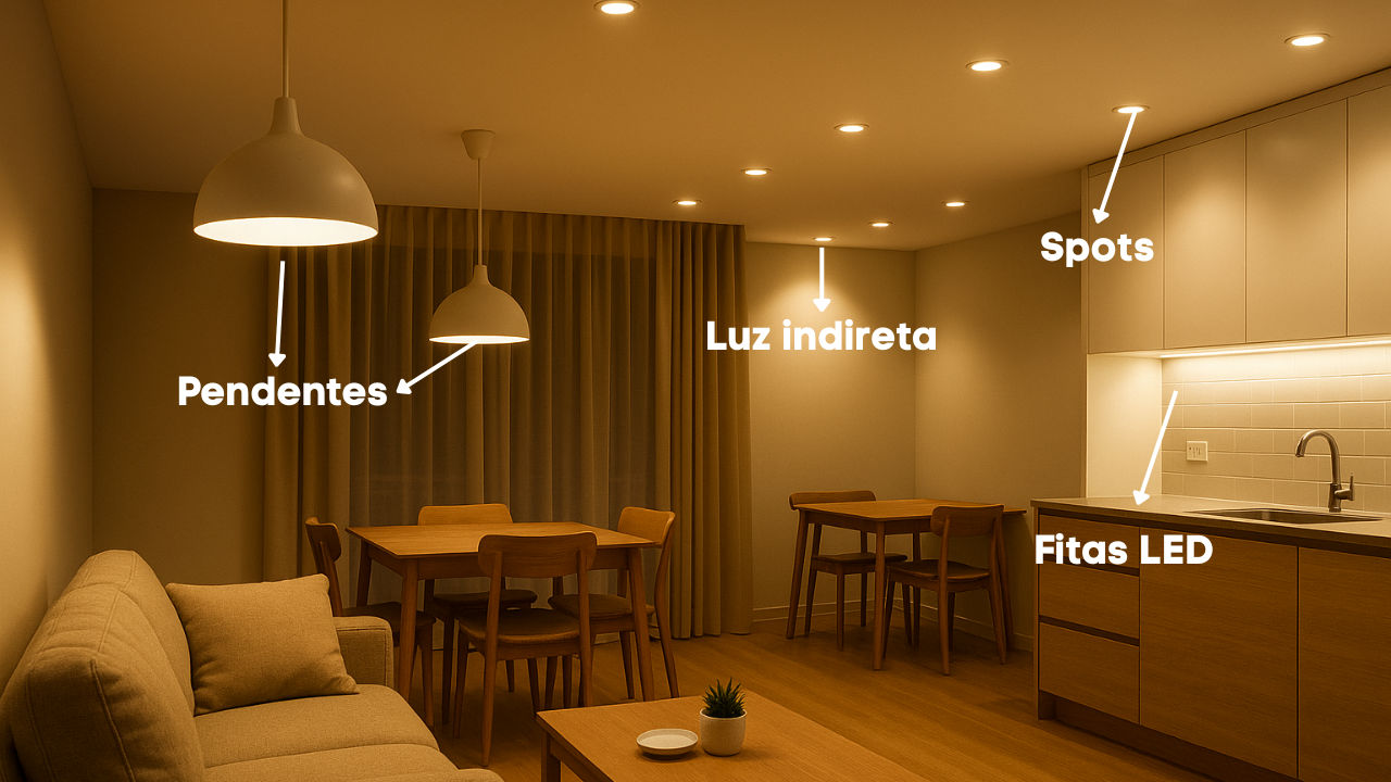 Combine luz geral + luz de apoio (abajures, spots, pendentes, fitas de LED).
