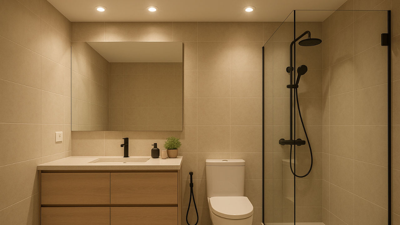 Combine luz geral branca neutra com pontos de iluminação focada ao redor do espelho. Isso garante boa iluminação para higiene e maquiagem, sem criar sombras indesejadas. Os painéis slim LED embutidos são perfeitos para esse ambiente.