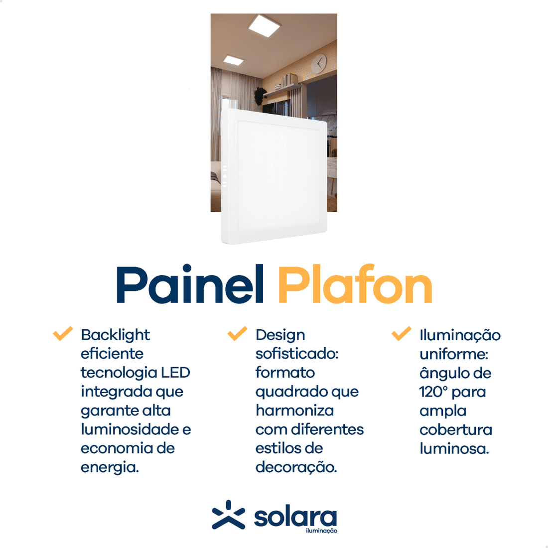 O Painel Plafon LED de Sobrepor 30W 40×40 cm Solara é a solução perfeita para quem busca iluminação clara, moderna e eficiente. Com instalação prática de sobrepor, dispensa cortes no teto e proporciona um acabamento limpo e elegante. Sua tecnologia backlight garante distribuição homogênea da luz, evitando pontos e sombras indesejadas.